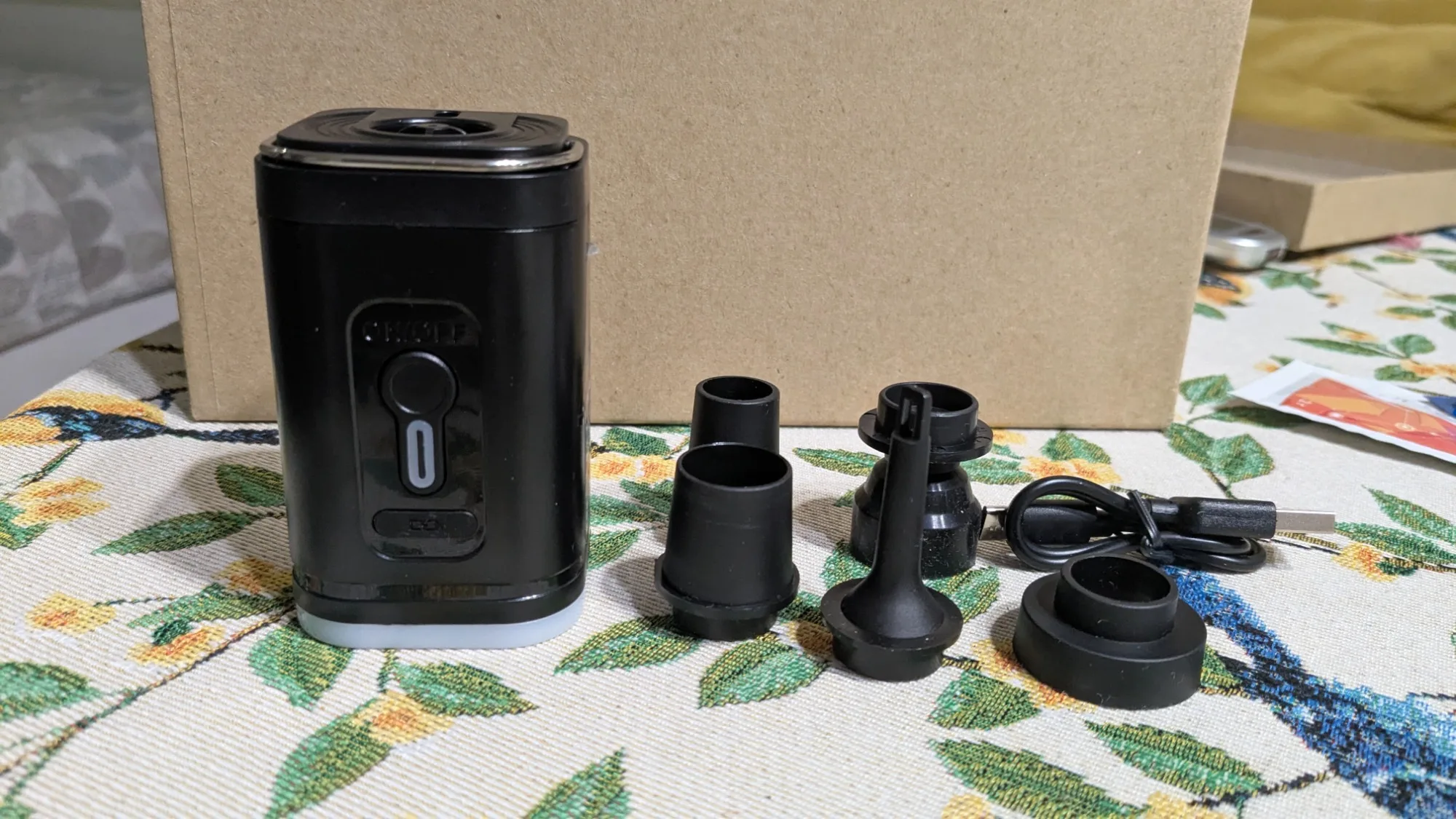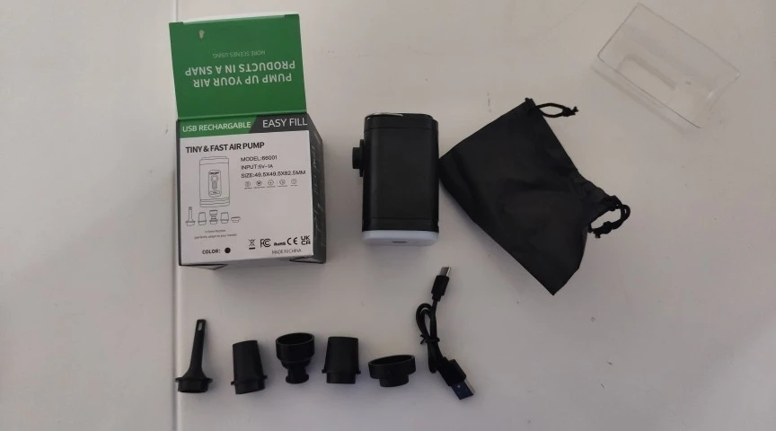 Excellent pump for camping needs! Inflates a single-person mattress in 1 minute, a pillow in 7 seconds. It’s a bit noisy, but for this duration of operation, it’s not a big deal at all. If all kinds of attachments and even a flashlight. Inflated 2 mattresses, 2 pillows, and the child even played with it a bit—still had some charge left. Compact, lightweight, fits in a small palm. There’s also a case, it’s convenient.