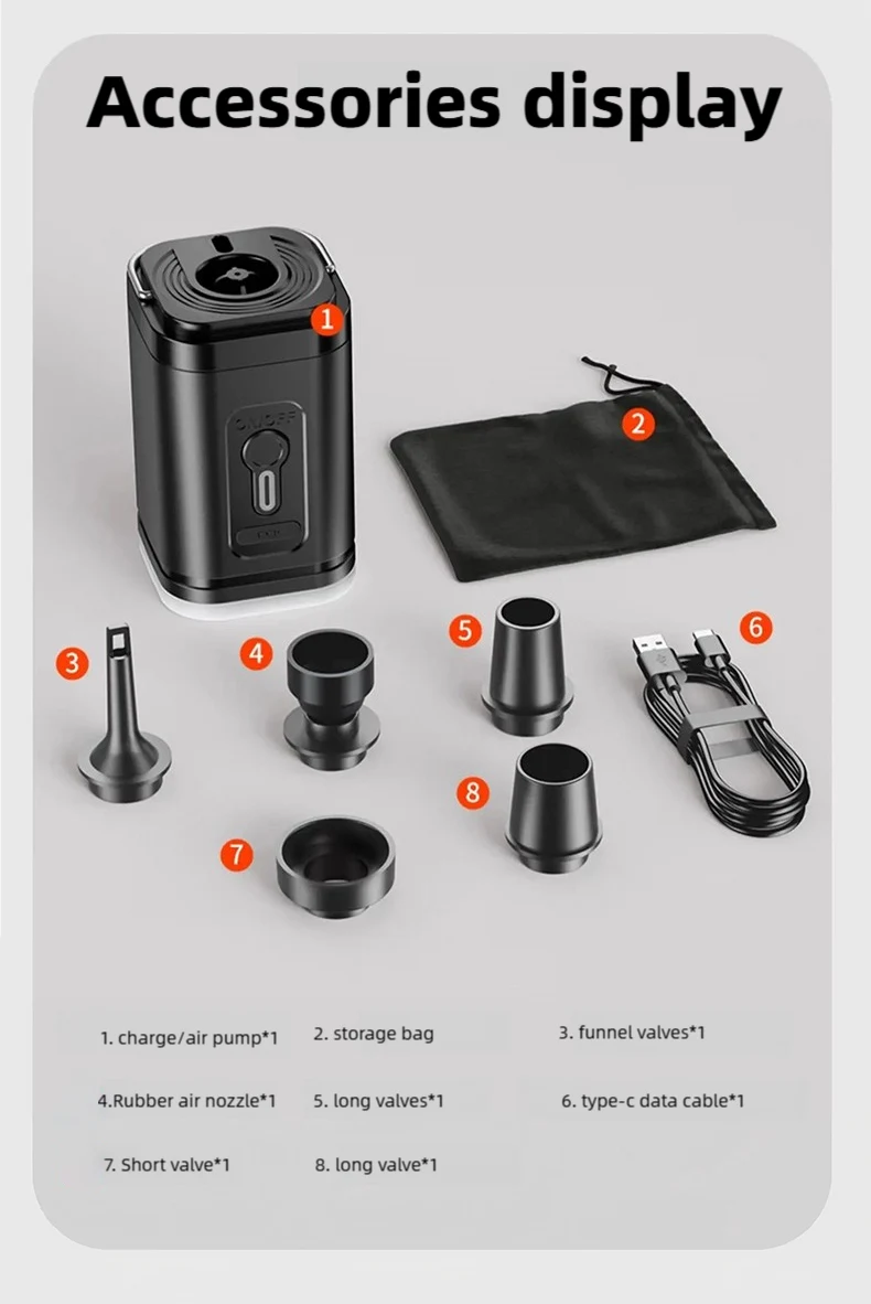 Dual Modes: Inflate (car tires, airbeds) + deflate (vacuum bags, saving 50% space).
